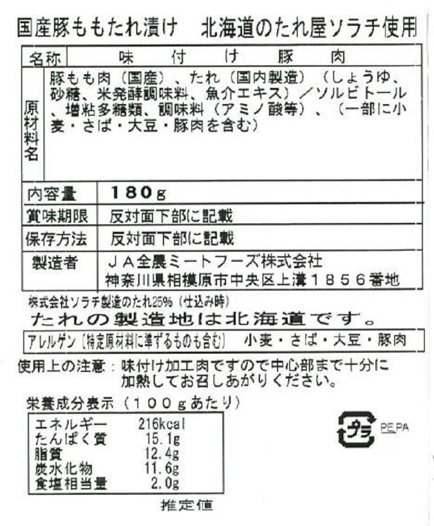 - 国産豚ももたれ漬け 北海道のたれ屋ソラチ使用 180g