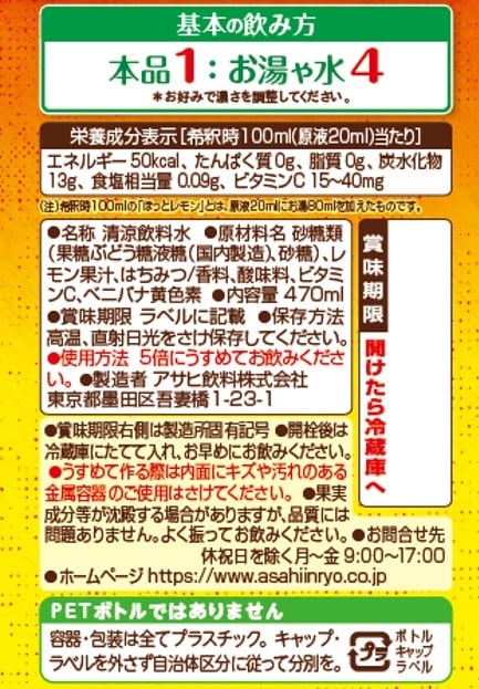 - ・ほっとレモン(希釈用)プラスチックボトル 470ml×5本