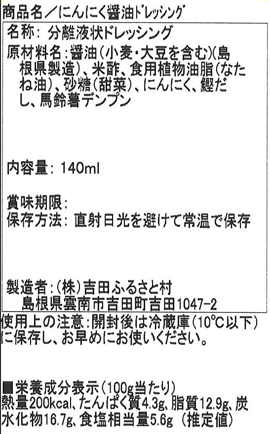 国産丸大豆醬油に国産のにんにくをたっぷり使用したドレッシングです。