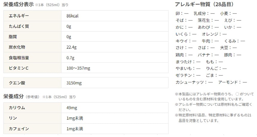 レモン果汁(レモン(アルゼンチン))、果糖ぶどう糖液糖、食塩、レモン果皮エキス/酸味料、ビタミンC、甘味料(アセスルファムK、スクラロース)、香料、紅花色素