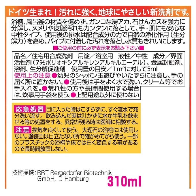 ガンコな湯アカや石けんカスを強力に分解し、ヌメリや皮脂汚れもカンタンに落とし、手肌にも安心な中性タイプ。