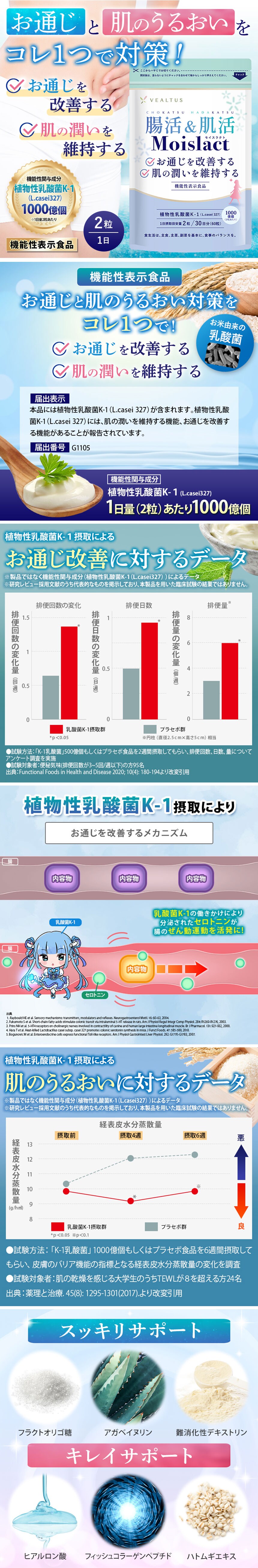 【届出表示】本品には植物性乳酸菌K-1(L.casei 327)が含まれます。植物性乳酸菌K-1(L.casei327)には、肌の潤いを維持する機能、お通じを改善する機能があることが報告されています。
