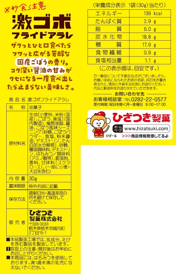 [24袋]ひざつき製菓 激ゴボフライドアラレ 30g | フワっと広がる芳醇な国産ごぼうの香りとコクの深い醤油の甘みがクセになるザクザク食感のスナック。