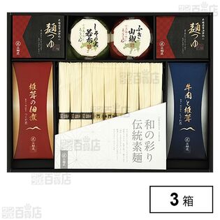 伝統ある三輪素麺と讃岐素麺、牛肉と椎茸のしぐれ煮、椎茸佃煮、しその実若布、ふき山椒と麺つゆを詰合せました。
