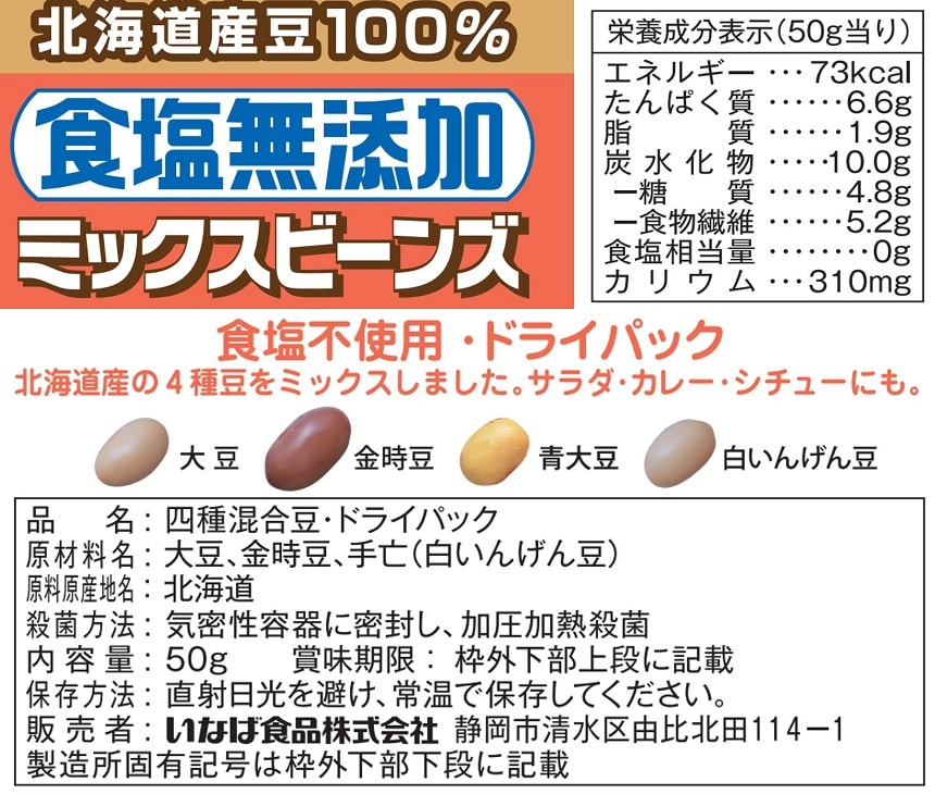 - 北海道産100% 食塩無添加ミックスビーンズ 50g×4袋パック