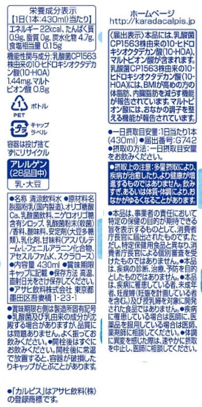 [24本]【機能性表示食品】アサヒ飲料 「カラダカルピスⓇBIO」430ml | カルピスⓇにおなかの調子を整える成分を配合した機能性表示食品。