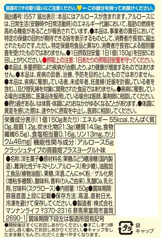 [30個]【機能性表示食品】マンナンライフ クラッシュタイプの蒟蒻畑プラスヨーグルト味 150g | 機能性関与成分アルロースの働きで、安静時や日常活動時のエネルギー代謝において脂肪の燃焼を高めます。
