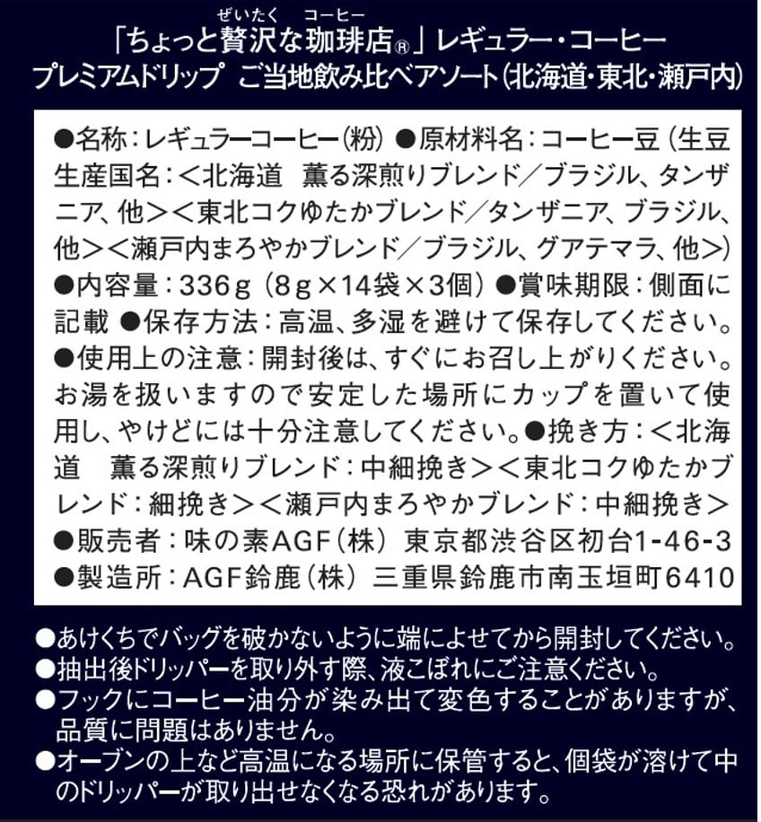 - 「ちょっと贅沢な珈琲店Ⓡ」レギュラー・コーヒー プレミアムドリップ ご当地飲み比べアソート(北海道・東北・瀬戸内)
