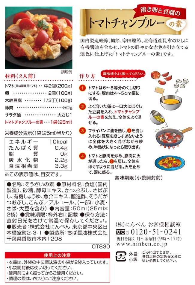 [40袋]にんべん だしが世界を旨くする 溶き卵と豆腐のトマトチャンプルーの素 50ml | 国内製造の鰹節、鯖節、宗田鰹節、北海道産昆布のだしに有機醤油を合わせ、 トマトの鮮やかな赤色を引き立てる淡