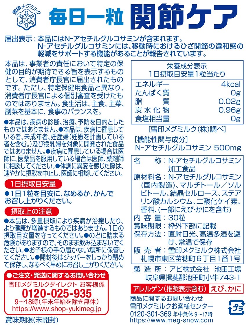 [計30日]雪印メグミルク 【機能性表示食品】毎日一粒 関節ケア 30粒(30日分) ×1個 | N-アセチルグルコサミンで移動時におけるひざ関節の違和感の軽減をサポート!