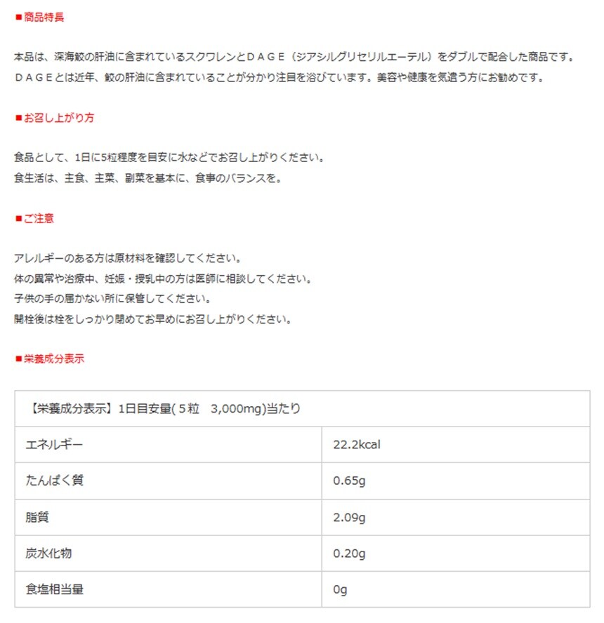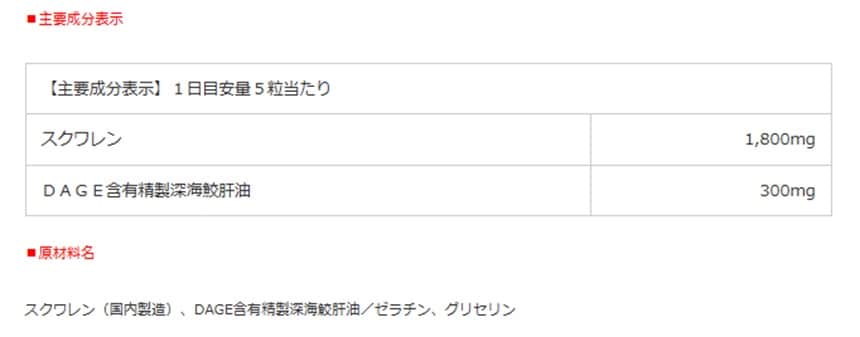 ワンランク上の鮫肝油製品として、スクワレン1,800mg、DAGE含有精製鮫肝油エキスを300mg配合しました。