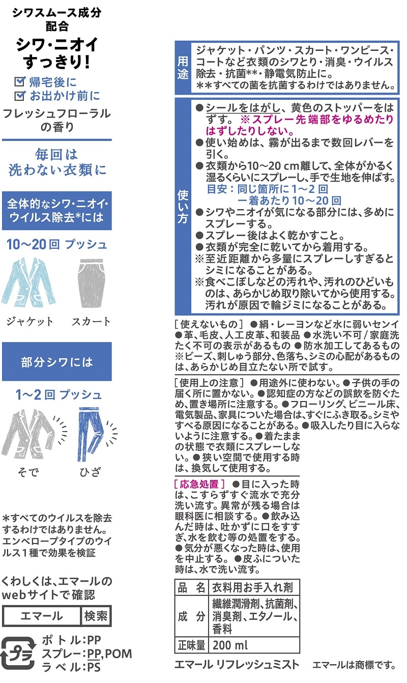 衣料用シワとり剤。シワスムース成分配合。ジャケット・パンツ・スカート・ワンピース・コートなど毎回は洗わない衣類のシワ・ニオイすっきり!ウイルス除去*も!抗菌効果※・静電気防止作用もあります。帰宅後やお出かけ前に。微香(フレッシュフローラルの香り)*すべてのウイルスを除去するわけではありません。エンベロープタイプのウイルス1種で効果を検証。※すべての菌を抗菌するわけではありません。