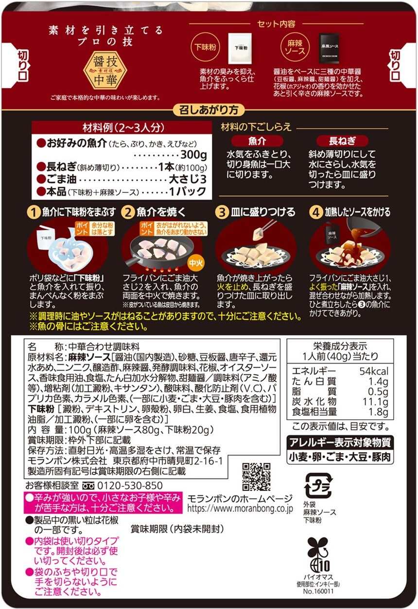 素材の臭みを抑え、魚介をふっくらジューシーに仕上げる下味粉と、醤油をベースに三種の中華醤(豆板醤、麻辣醤、甜麺醤)を加え、花椒(ホアジャオ)の香りを効かせたあと引く辛さのソースがセットになった商品です。
