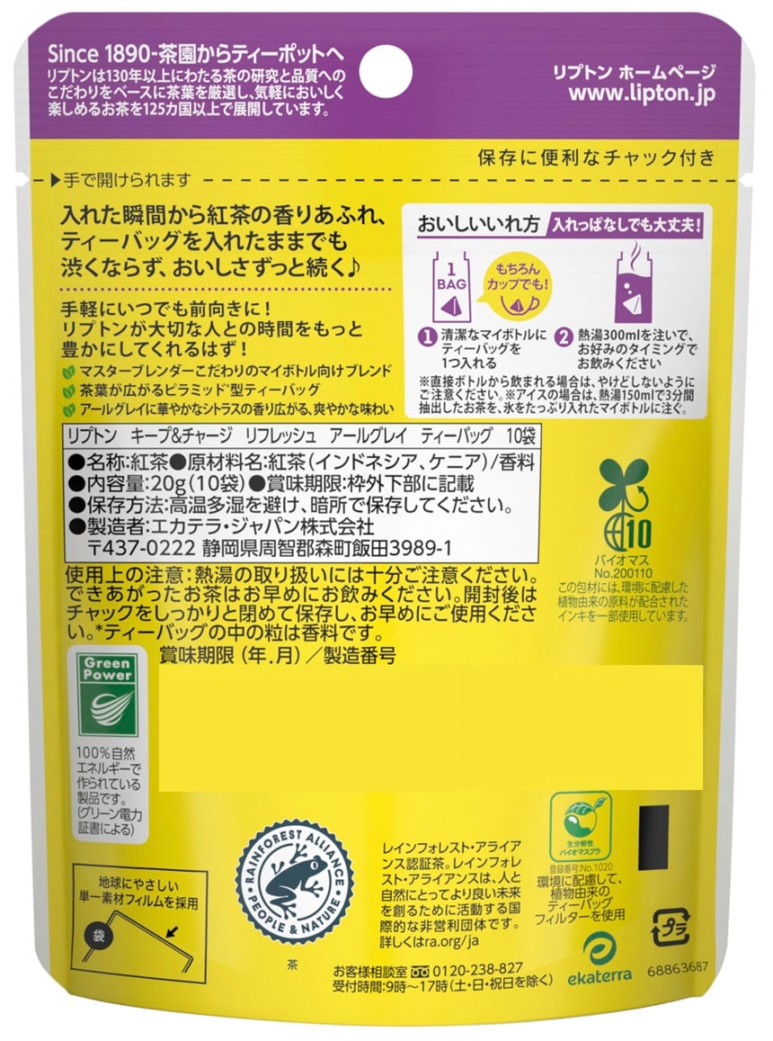 【リプトン キープ&チャージ リフレッシュ アールグレイ ティーバッグ 10袋入】