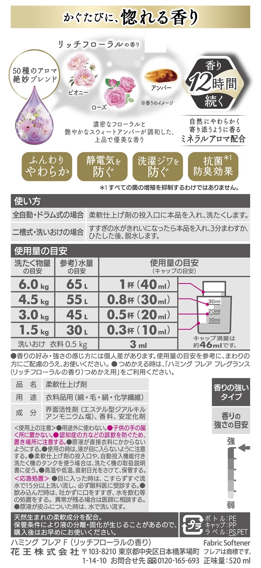 [8本]花王 ハミングフレアフレグランス リッチフローラル 本体 520ml ※商品改廃に伴う特別お試し費用 | 50種のアロマ絶妙ブレンド。かぐたびに、惚れる香り。香り12時間続く。