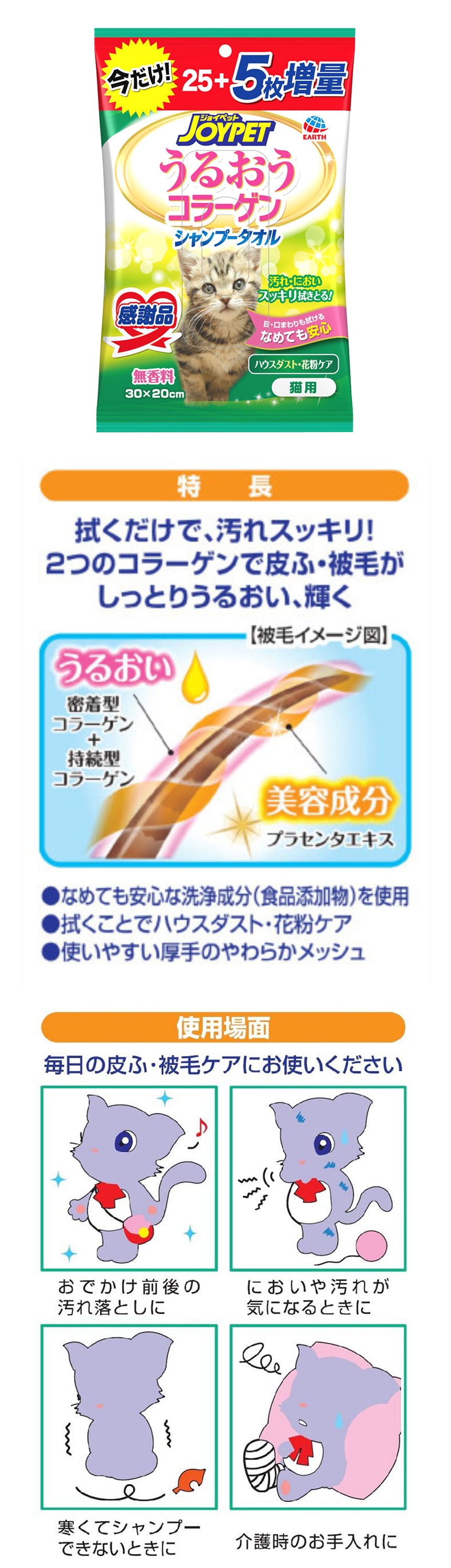 ● 拭くだけで、におい・よごれスッキリ!コラーゲン、ヒアルロン酸の保湿効果で皮ふ・被毛にうるおいを与える。