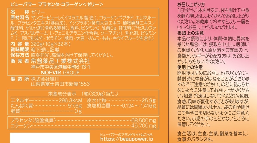 [計32本]常盤薬品工業 ビューパワー プラセンタ・コラーゲン<ゼリー> 10g×32本入×1個 | プラセンタやコラーゲンなどの美容サポート成分配合の美容ゼリー
