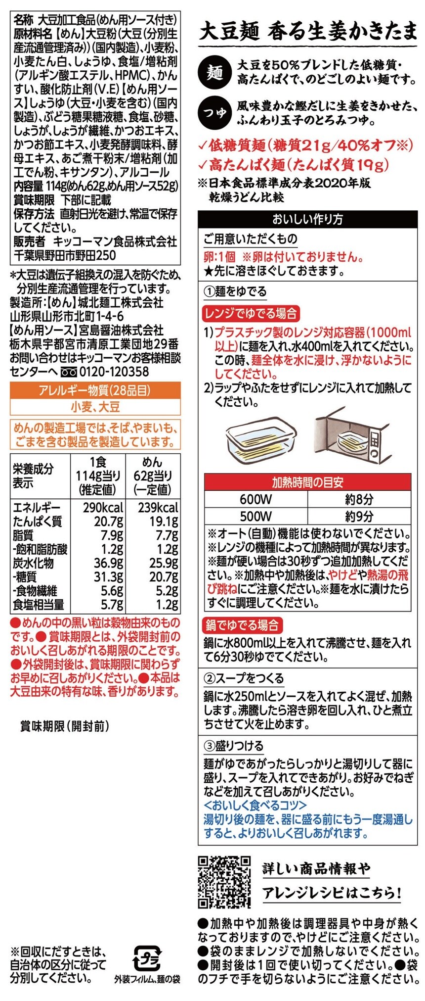 大豆を50%ブレンドした低糖質・高たんぱくでのどごしのよい麺に、満足感のある1食に仕上がるスープをセットにしました。