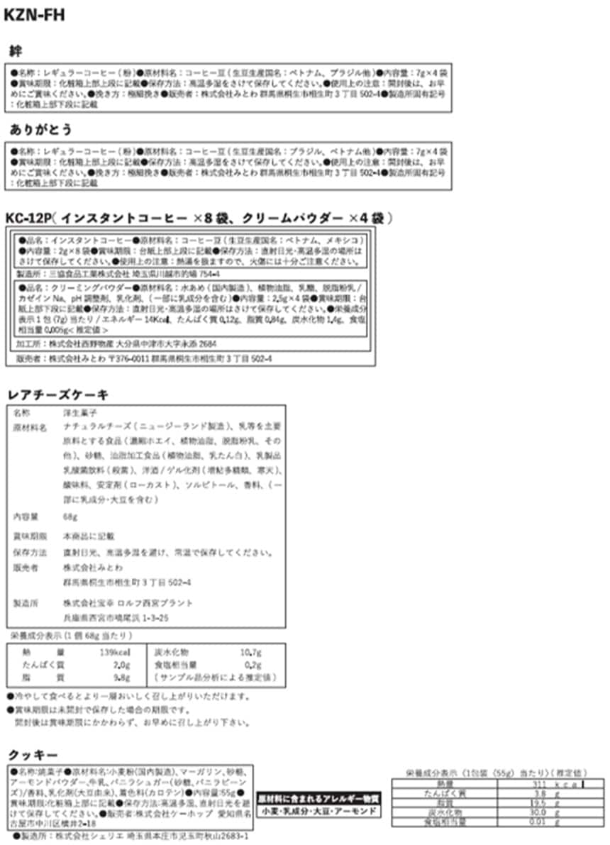 絆ドリップコーヒー、ありがとうドリップコーヒー、ホテル仕様のインスタントコーヒーとクリームパウダー、レアチーズケーキ、人気の高い菓子メーカーのクッキーのセット。