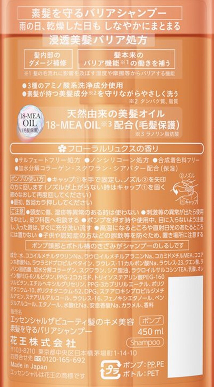[24個]花王 エッセンシャル ザビューティ 髪のキメ美容素髪を守るバリアシャンプー ポンプ 450ml | 素髪を守るバリアシャンプー。雨の日、乾燥した日もしなやかにまとまる。