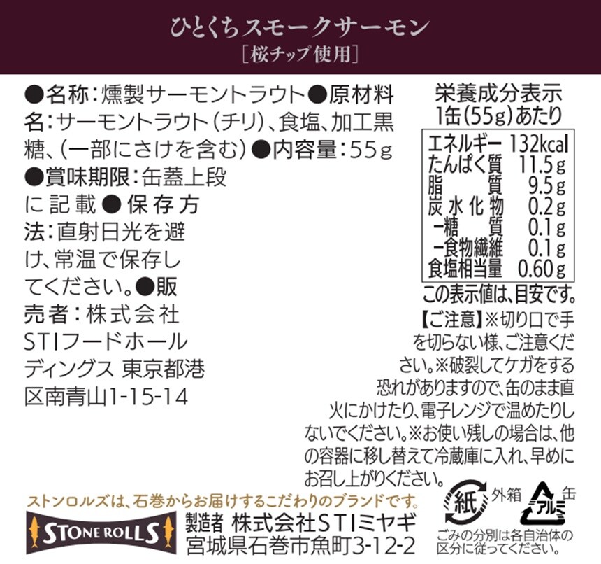 サーモンに黒糖をまぶして旨味を付与し、桜チップで燻した本格的なスモークサーモンをそのまま缶に詰めました。