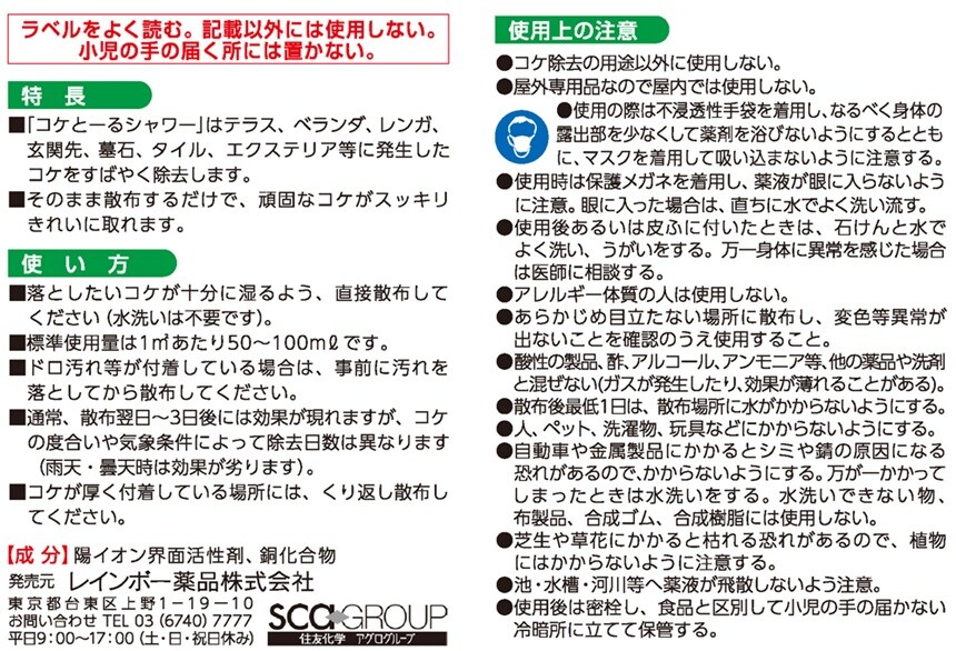 ・落としたいコケが十分湿るよう、直接散布してください(水洗いは不要です)。