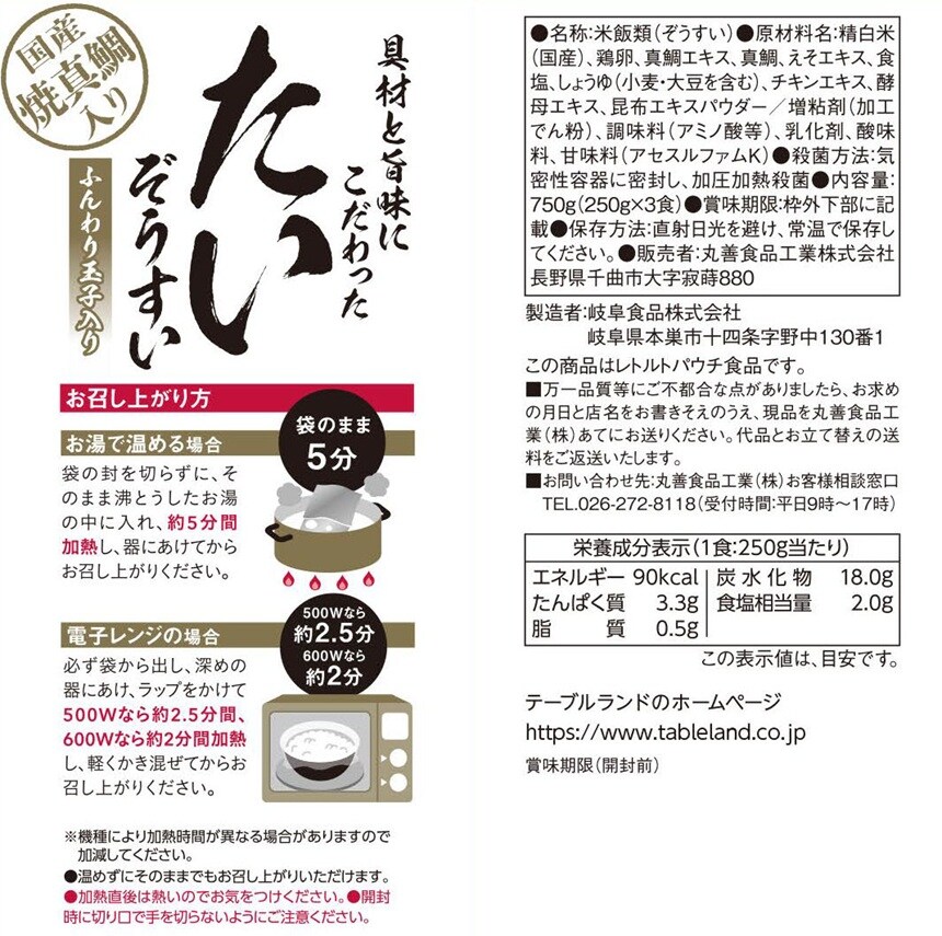 [計24食]テーブルランド たいぞうすい 3食パック×8個 | 国産焼真鯛を使用し、香りと風味にこだわりました。