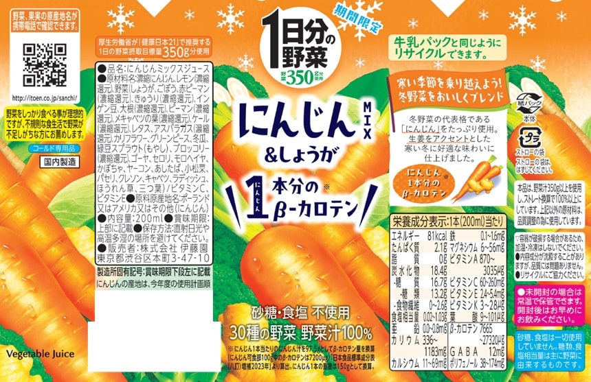 冬野菜の代表格「にんじん」をはじめ30種の野菜を使用した野菜汁100%飲料です。