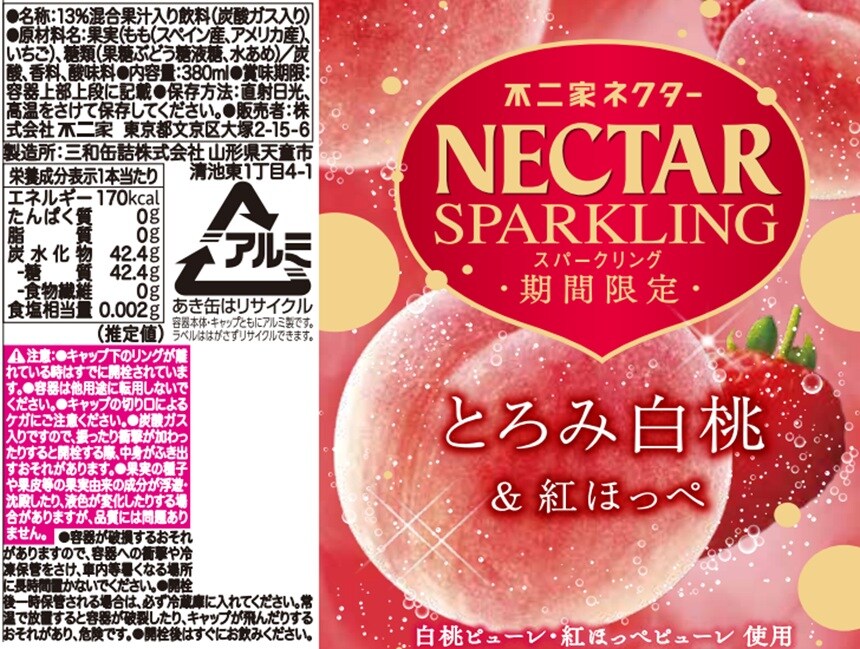 - 不二家 ネクタースパークリング とろみ白桃&紅ほっぺ ボトル缶 380ml