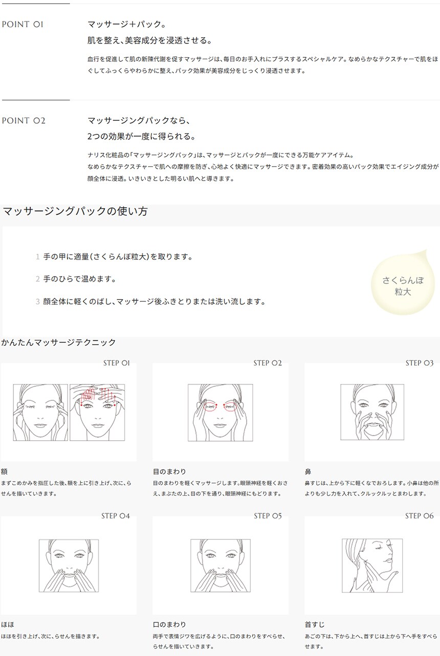○ マッサージとパックの効果でお肌の血行を促進し、ハリ・弾力・透明感のあるお肌に。