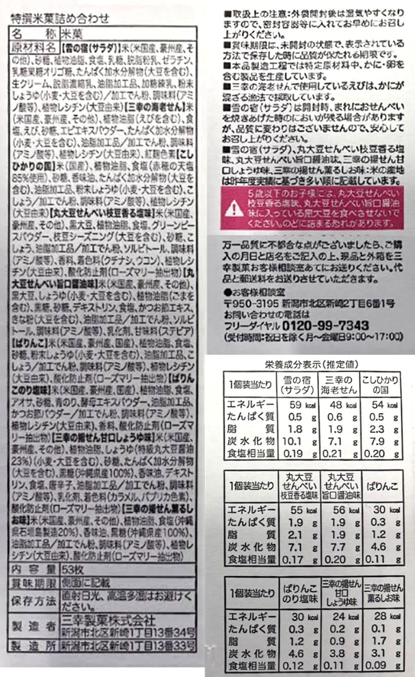 雪の宿(サラダ)、三幸の海老せん、こしひかりの国、丸大豆せんべい枝豆香る塩味、丸大豆せんべい旨口醤油味、ぱりんこ、ぱりんこのり塩味、三幸の揚せん甘口しょうゆ味、三幸の揚せん薫る塩味の詰め合わせ