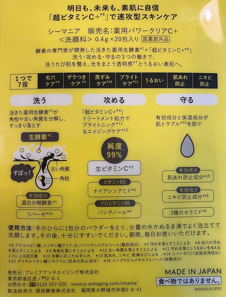 [計40包]【医薬部外品】 プレミアアンチエイジング Cマニア 薬用パワークリアC+ 0.4g×20包×2個 | うるおい素肌へ導くビタミン洗顔料