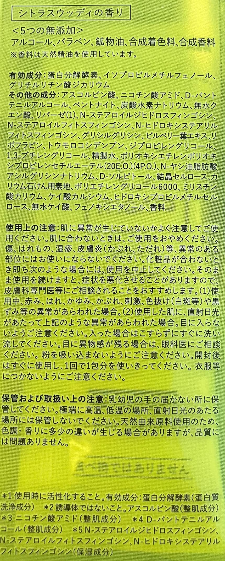 肌に異常が⽣じていないかよく注意してご使用ください。肌に合わないときは、ご使⽤をおやめください。傷、はれもの、湿疹、皮膚炎(かぶれ、ただれ)等、異常のある部位にはお使いにならないでください。化粧品が合わないとき即ち次のような場合には、使用を中止してください。そのまま使⽤を続けますと、症状を悪化させることがありますので、⽪膚科専⾨医等にご相談されることをおすすめします。(1)使⽤中、⾚み、はれ、かゆみ、かぶれ、刺激、⾊抜け(⽩斑等)や⿊ずみ等の異常があらわれた場合。(2)使⽤した肌に、直射⽇光があたって上記のような異常があらわれた場合。目に入らないようご注意ください。入った場合はこすらずにすぐに洗い流してください。目に異物感が残る場合は、眼科医にご相談ください。 粉を吸い込まないようにご注意ください。開封後はすぐに使用し、1回で1包分を使いきってください。 衣服等につかないようにご注意ください。