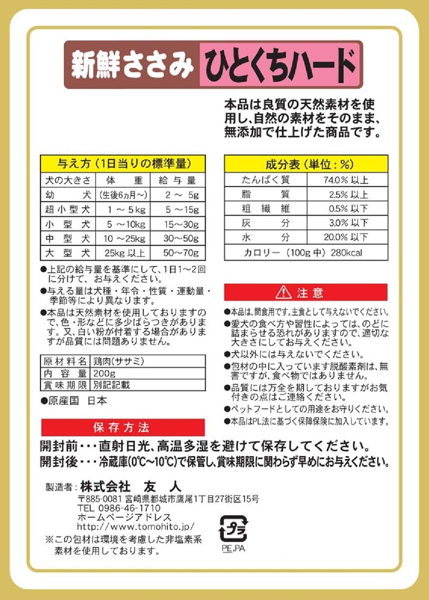 ・低脂肪で良質なタンパク質の新鮮な鶏ササミを使用し、自然の素材をそのまま、無添加で仕上げました。