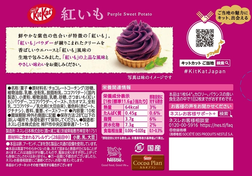 「紅いも」パウダーが練りこまれたクリームを香ばしいウエハースで挟み、「紅いも」風味の生地で包み込みました。