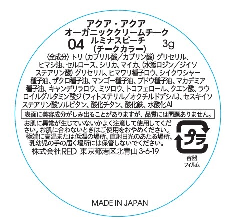 [6個]RED アクア・アクア オーガニッククリームチーク 04 ルミナスピーチ 3.0g ※リニューアル前商品 | チークゾーンにツヤ&血色感を与えるクリームチーク