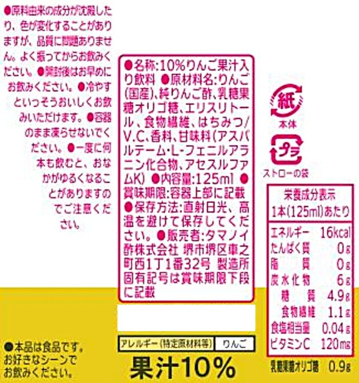 純りんご酢の他に、食物繊維、ビタミンC、オリゴ糖を配合。