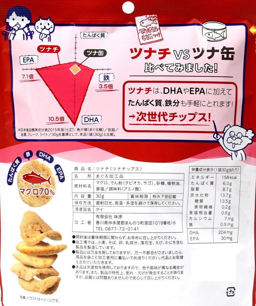 マグロを70%配合した、保存料・着色料不使用のツナチップスです。