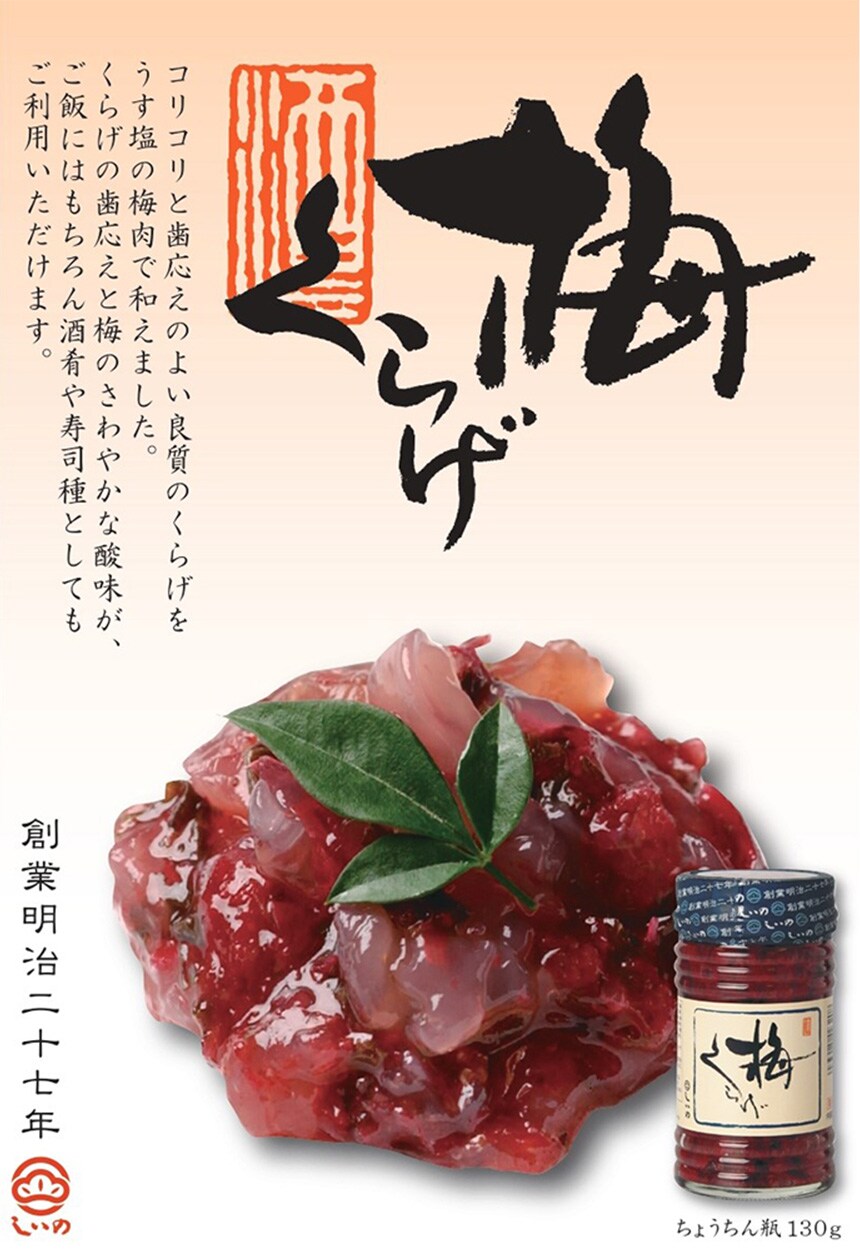 くらげの歯応えと梅の爽やかな酸味が、ご飯にもちろん酒肴や寿司種としてもご利用頂けます。