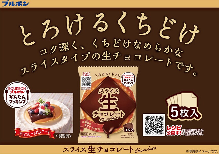 とろけるくちどけ!「のせて」「巻いて」「包んで」 「型を抜いて」、トーストやお菓子作りに本格的な生チョコアレンジができる食品シートです。コク深く、とろけるくちどけの生チョコレートをお楽しみください。