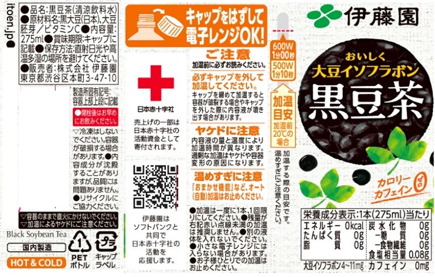 大豆イソフラボンを4~11mg(1本=275ml当たり)含んだカロリー・カフェインゼロの黒豆茶飲料です。