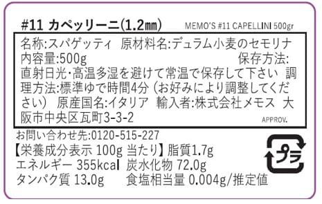 [24袋]メモス ディヴェッラ #11 カペッリーニ 1.20mm 500g | 極細パスタ。食べやすく心地よい食感で、冷製やフルーツを使ったパスタでも楽しまれています。