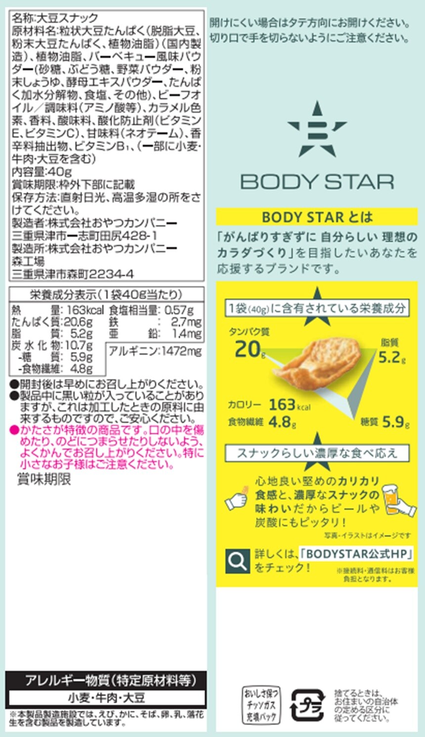 [12個]おやつカンパニー BODYSTAR プロテインスナック BBQ 40g | 1袋でタンパク質が20g摂れるプロテインチップス。高タンパク大豆スナックのBODYSTAR
