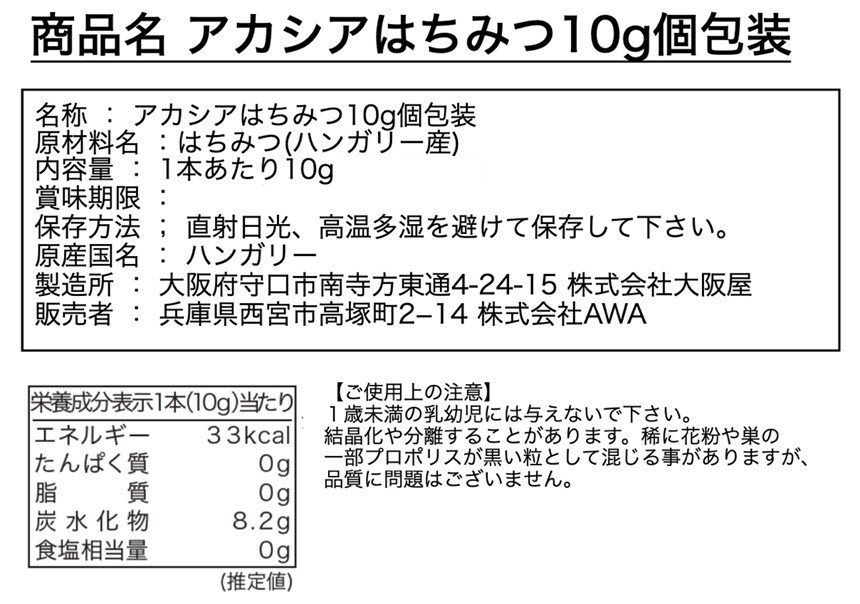 ハンガリー産アカシアはちみつ10gが簡単に喫食できます。