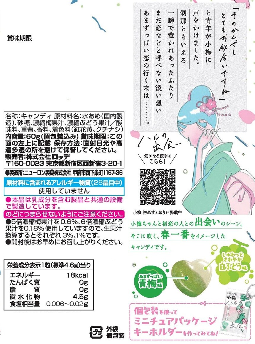 小梅の初恋物語のワンシーンを切り取ったようなパッケージとそこに吹く春一番をイメージしたさわやかであまずっぱい味わいのキャンディです。