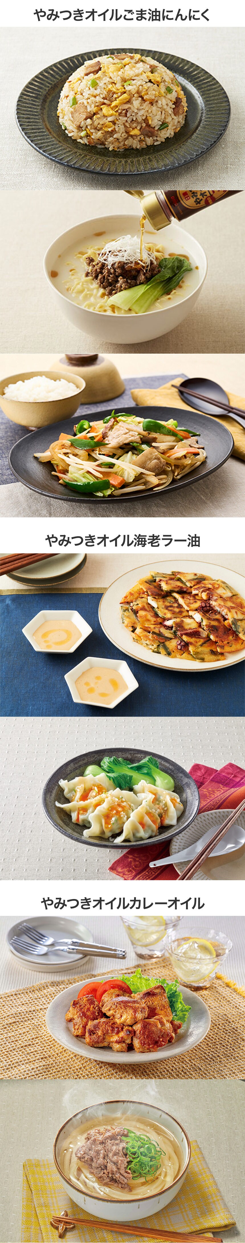 みんなが大好き、思わず「やみつく味」が楽しめるオイルです。かけて、炒めて、いつもの料理に調味料感覚でお使い頂けます。クセになるにんにくやスパイス、香味野菜の旨みと香りをごま油にとじ込めた、ちょい辛がクセになる無敵のオイル。