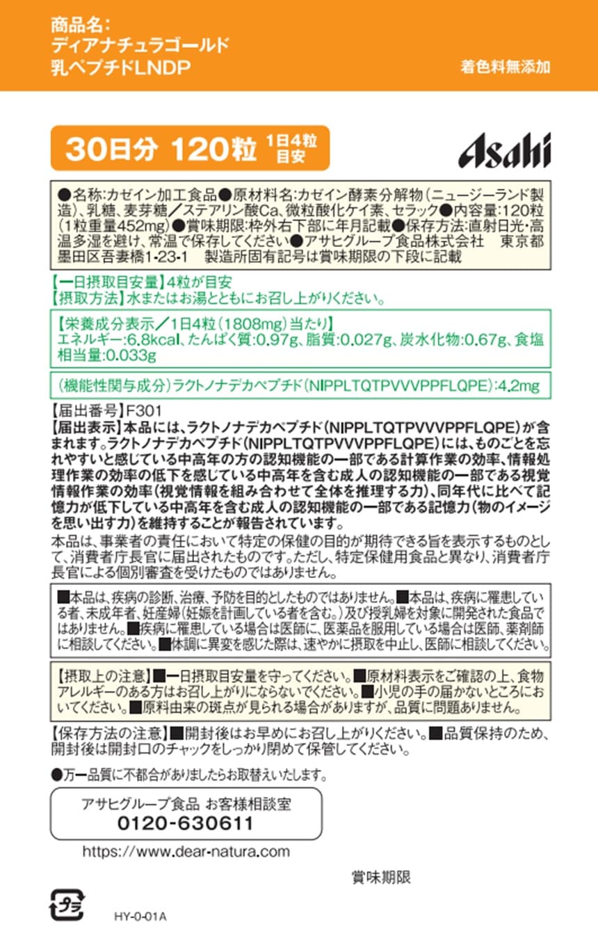 [8個]【機能性表示食品】アサヒグループ食品 ディアナチュラゴールド 乳ペプチドLNDP 30日分(120粒入) | 記憶力、計算作業の効率を維持することが報告されている ラクトノナデカペプチド配合