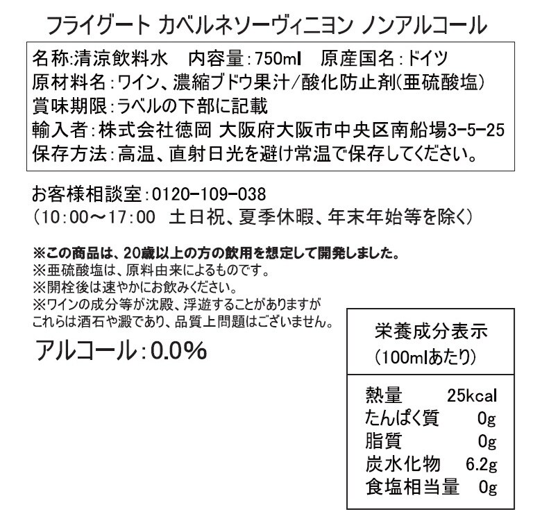 [6本]徳岡 フライグート カベルネソーヴィニヨン ノンアルコール 750ml | イチゴやチェリーのような華やかな香りが特徴のノンアルコールワインです。
