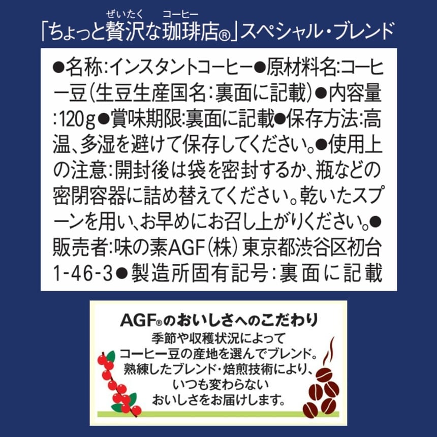 "お湯を注ぐと贅沢ブラック。"「ちょっと贅沢な珈琲店」インスタント・コーヒーは、季節や産地特徴によって豆の個性を引き出す焙煎と抽出。コーヒー豆を選定。珈琲店のマスターが淹れたような香り・味をパウダーに閉じこめました。熱をかけずに-40℃で真空乾燥させるフリーズドライ製法なので、コーヒー本来の豊かな香りとコクの風味を逃さずに、淹れたてのコーヒーの味わいをお楽しみいただけるインスタントコーヒーです。AGF(エージーエフ) 「ちょっと贅沢な珈琲店」 スペシャル・ブレンド袋120gは、ブラジル産最上級グレード豆タイプ2の特徴を活かした濃く芳醇な香りと深いコク。ちょっと贅沢な珈琲店 袋入り詰め替えタイプです。お試ししやすい中容量、袋入り詰め替え用(エコパック)タイプ。クリップなどで閉じて袋のままでもお使いいただけます。コーヒー豆の焙煎から充填まで国内の工場で生産し、繊細な日本人の味覚に合わせて開発。珈琲店のマスターが淹れたような香り・味をパウダーに閉じ込めました。あとはお湯を注ぐだけ。香り広がる贅沢なブラックコーヒーを、どうぞ心ゆくまでお愉しみください。AGFの詰め替え用袋タイプは、インスタントコーヒーではじめてのエコマーク認定を取得した省資源容器です。