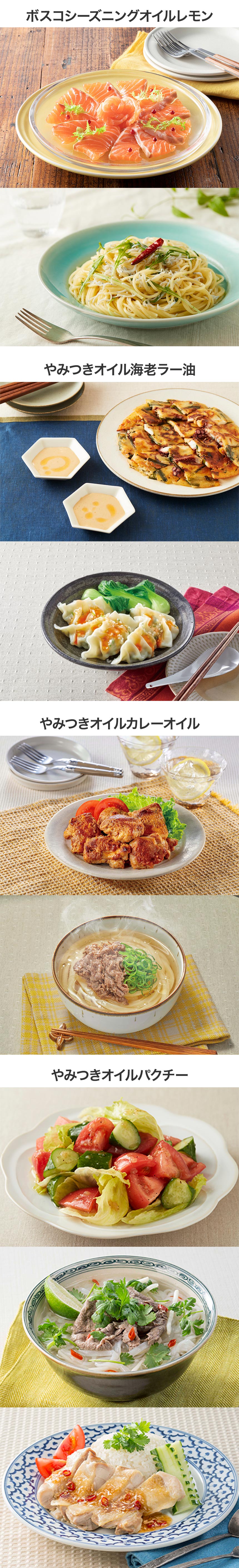 日清やみつきオイルは、いつもの料理を、かけるだけで簡単にみんなが大好きな「やみつき味」にしてしまう調味料です。